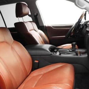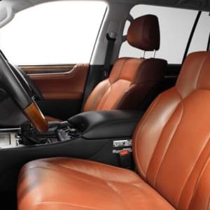 отделка салона кожей semi-aniline красно-коричневого цвета, потолок серый (комбинация искусственной и натуральной кожи)