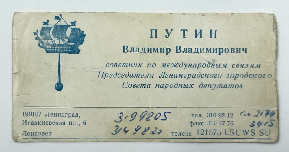 Ранее сообщалось , что визитку Путина времен его работы в Ленинградском горсовете продают на аукционе.