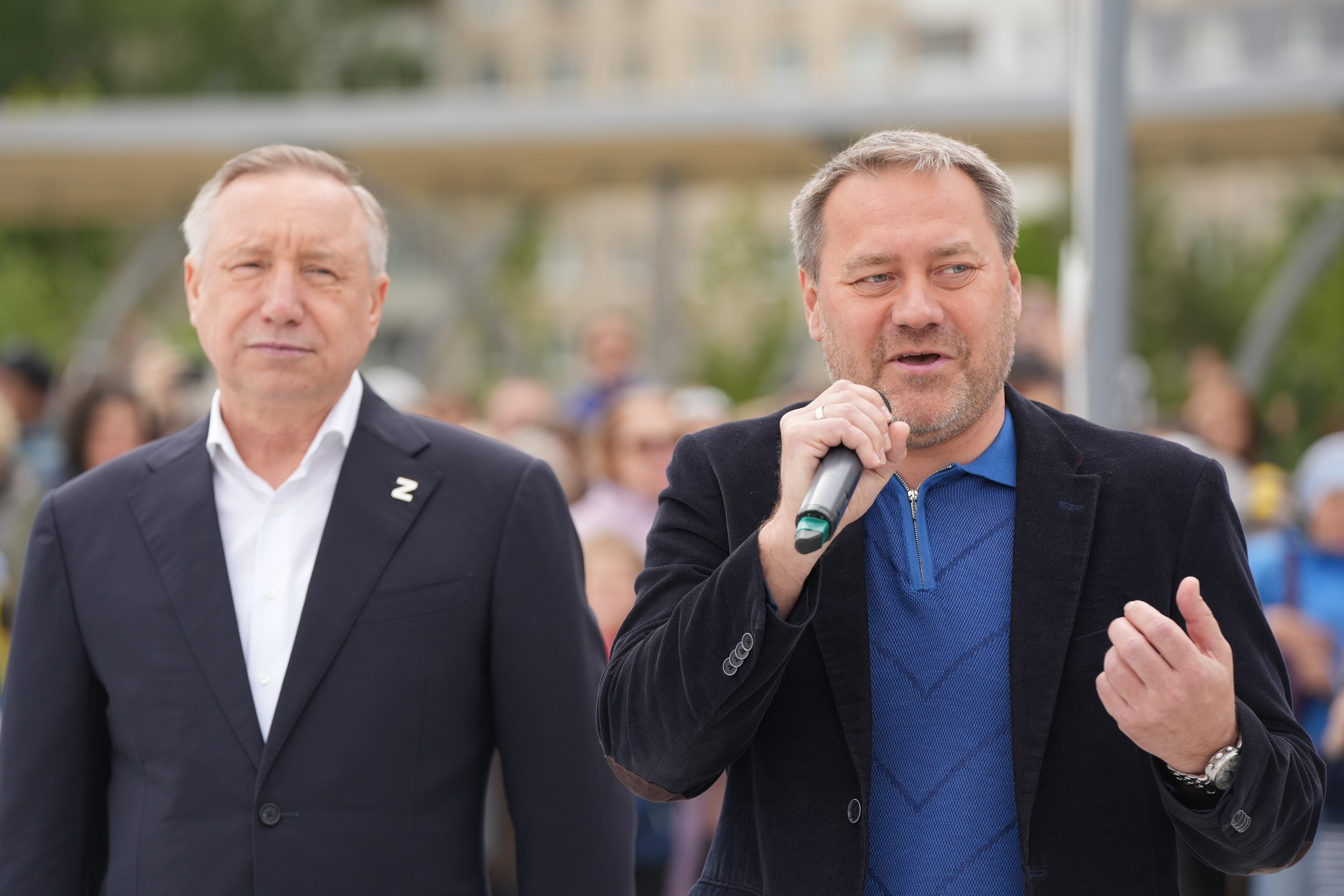 Председатель Законодательного Собрания Санкт-Петербурга Александр Бельский и Губернатор города Александр Беглов торжественно открыли новое общественное пространство с фонтанным комплексом в Колпино.