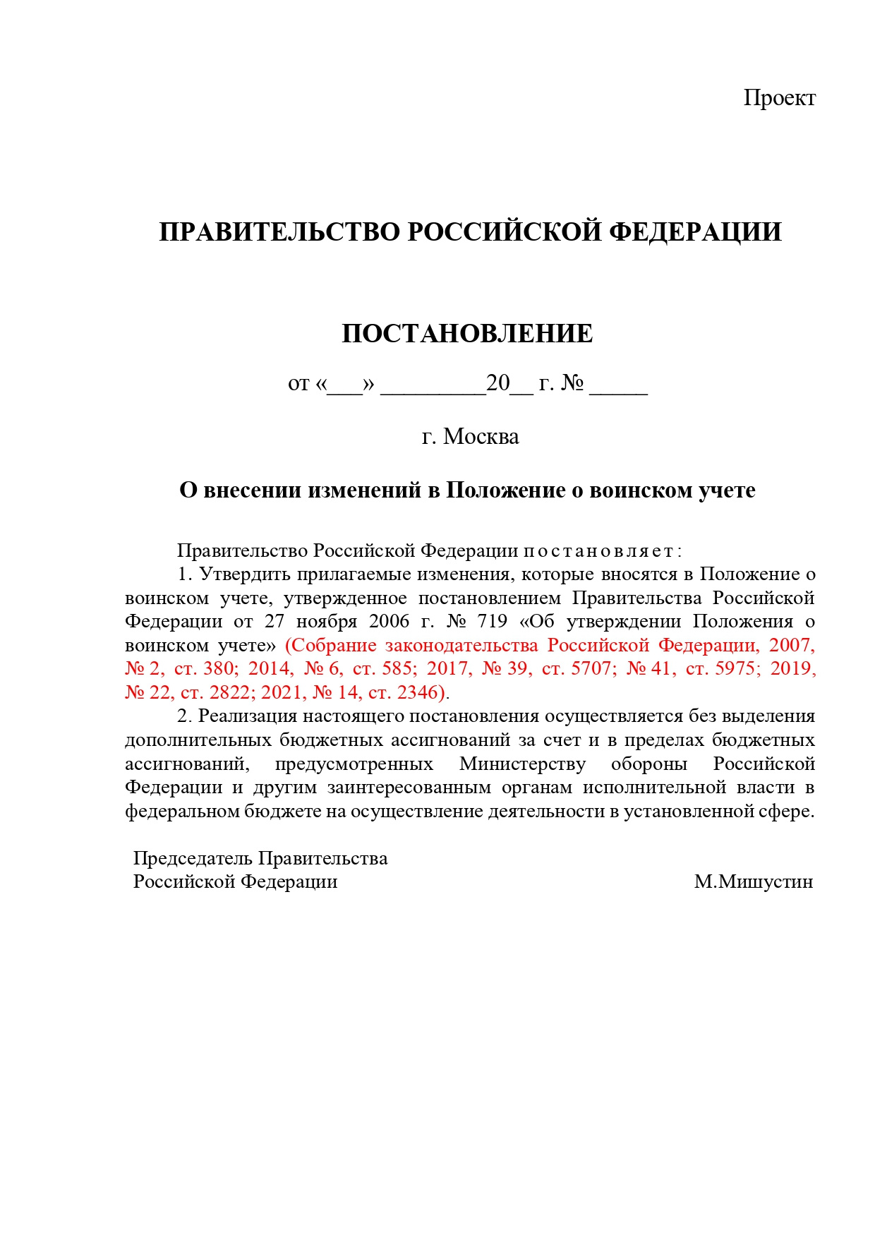 Проект постановления правительства, касающийся изменений воинского учета, внесен Минобороны РФ.