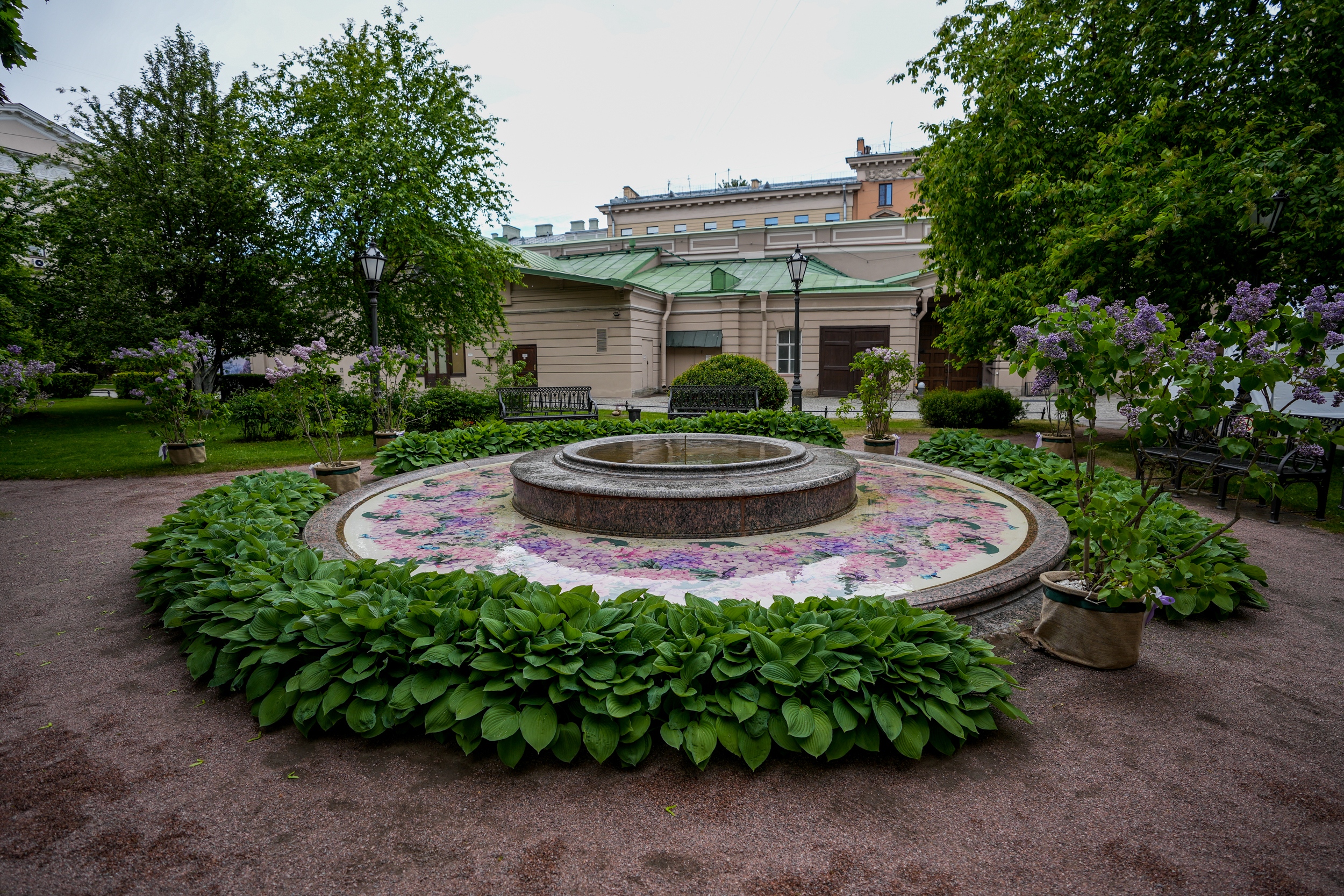 В саду Мариинского дворца растут яблоня китайская, черёмуха Маака, айва японская, груша, шиповник, клён серебристый, клён татарский, дуб, сирень, розы. А изюминка сада – сиреневый фонтан и редкие сорта сирени в кадках из известных питомников России.