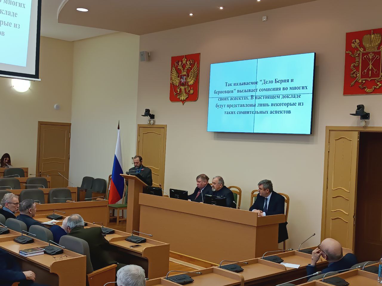 В президиуме находились заместитель председателя Комитет по внешним связям Санкт‑Петербурга Вячеслав Калганов и председатель Санкт‑Петербургского отделения Союза писателей России Борис Орлов, который обратил внимание на публикацию в Литературной газете к юбилейной дате беспристрастной статьи о Л.П.Берия.