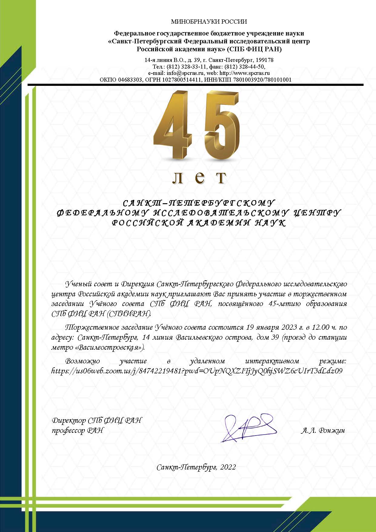 Ученый совет и Дирекция Санкт-Петербургского Федерального исследовательского центра Российской академии наук приглашают Вас принять участие в торжественном заседании Учёного совета СПб ФИЦ РАН, посвящённого 45-летию образования СПб ФИЦ РАН (СПИИРАН).