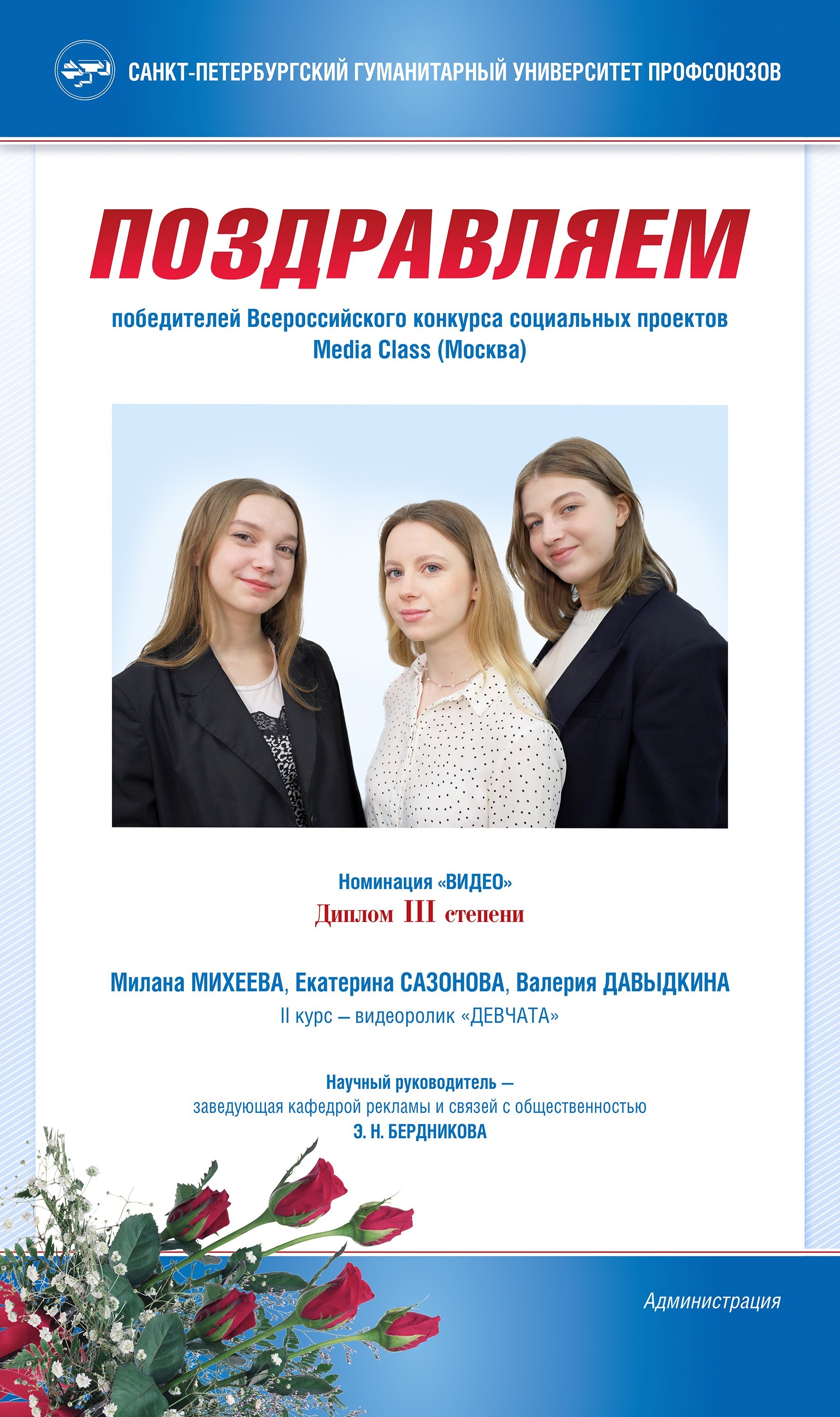 Студенты кафедры рекламы и связей с общественностью факультета культуры СПбГУП Милана Михеева, Екатерина Сазонова, Валерия Давыдкина – в числе победителей XXII Всероссийского фести