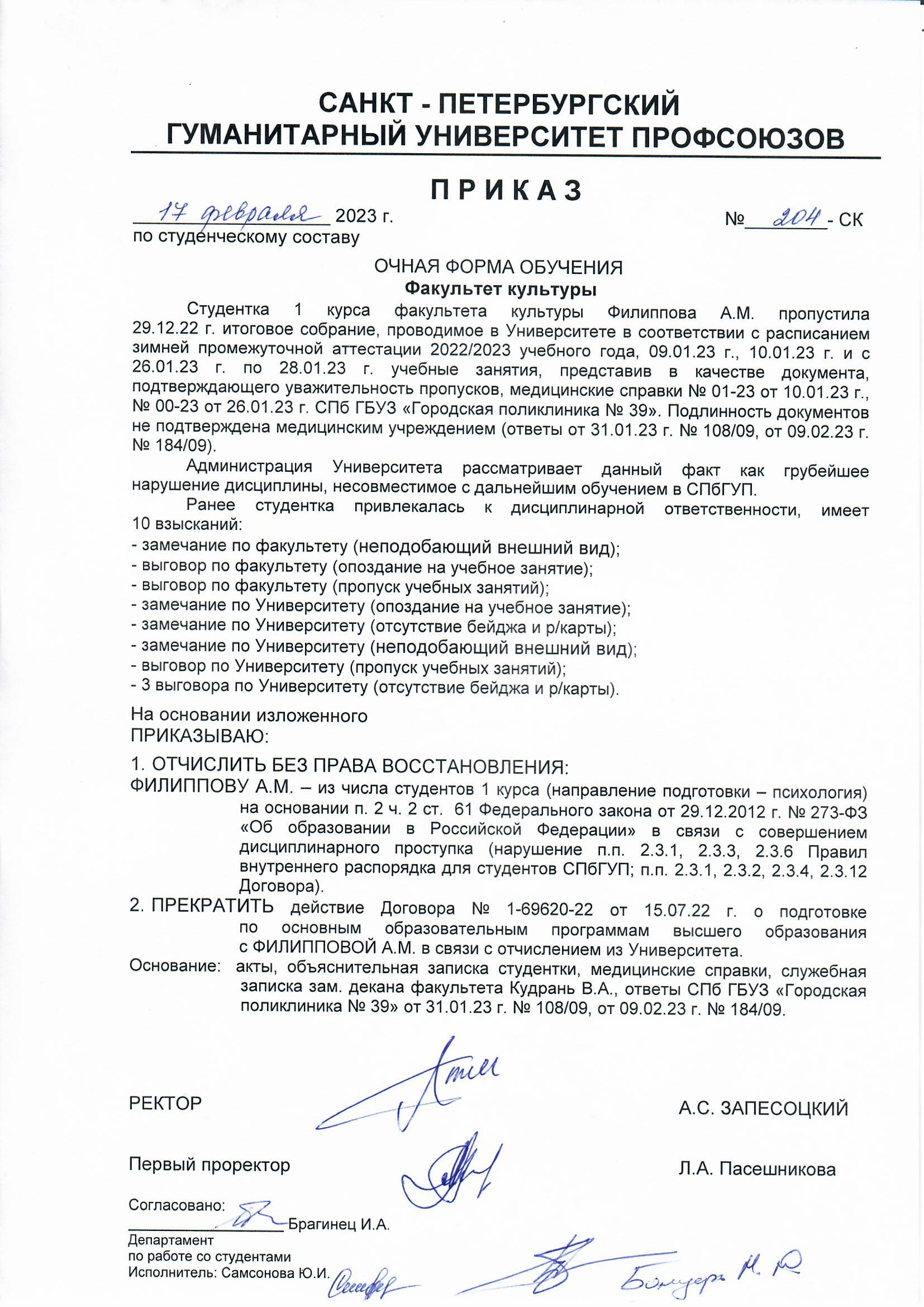 За прогулы и предоставление фальшивых справок отчислена без права восстановления студентка 1-го курса факультета культуры Филиппова А.М.