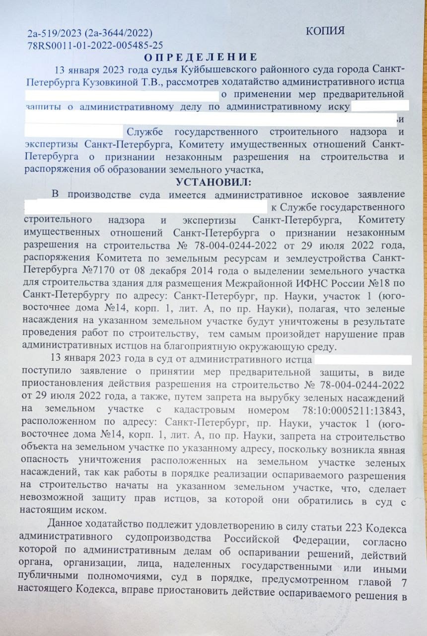 13 января 2023 года Куйбышевский районный суд удовлетворил ходатайство о наложении обеспечительных мер, предусматривающих остановку всех видов работ на территории полувекового сквера у дома № 14 по проспекту Науки.