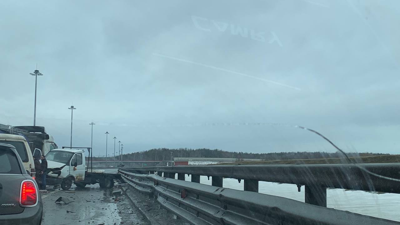Два грузовых автомобиля на время превратили кольцевую автодорогу на западе Петербурга в «бутылочное горлышко».
