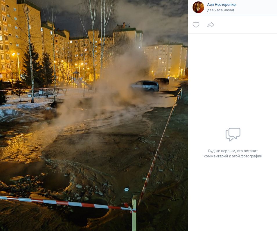 На кадрах видно, что густой пар поднимается от земли в месте, где произошел разлив горячей воды. Несмотря на то, что территория огорожена сигнальной лентой, кипяток, по словам очевидцев, распространяется дальше, угрожая припаркованным поблизости автомобилям.