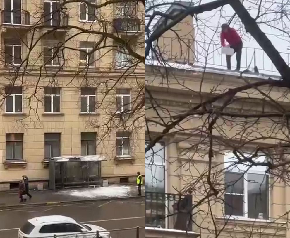 Люди внизу пригибались, прикрывали головы и ускоряли шаг, надеясь не получить травмы. В кадр попал человек в желтом жилете — предположительно, сотрудник коммунальных служб. Он просто смотрел на происходящее, не пытаясь предупредить прохожих об опасности или прекратить действия человека на крыше. Очевидцы сообщают, что зону «уборки» никак не оградили, на месте не было сигнальных лент, а также никакого страховочного оборудования.