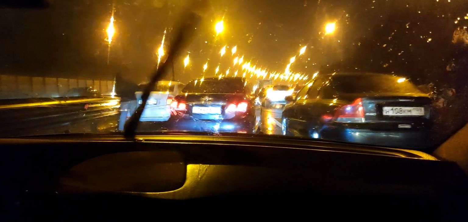 Водители медленно объезжали пробку, машины, стоящие на аварийной сигнализации, заняли несколько полос.