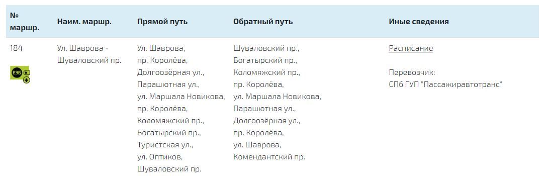 По данным, опубликованным на сайте СПб ГКУ«Организатор перевозок», автобус № 184 курсирует между остановкой «Улица Шаврова» и Шуваловским проспектом. Обслуживанием занимается СПб ГУП «Пассажиравтотранс».