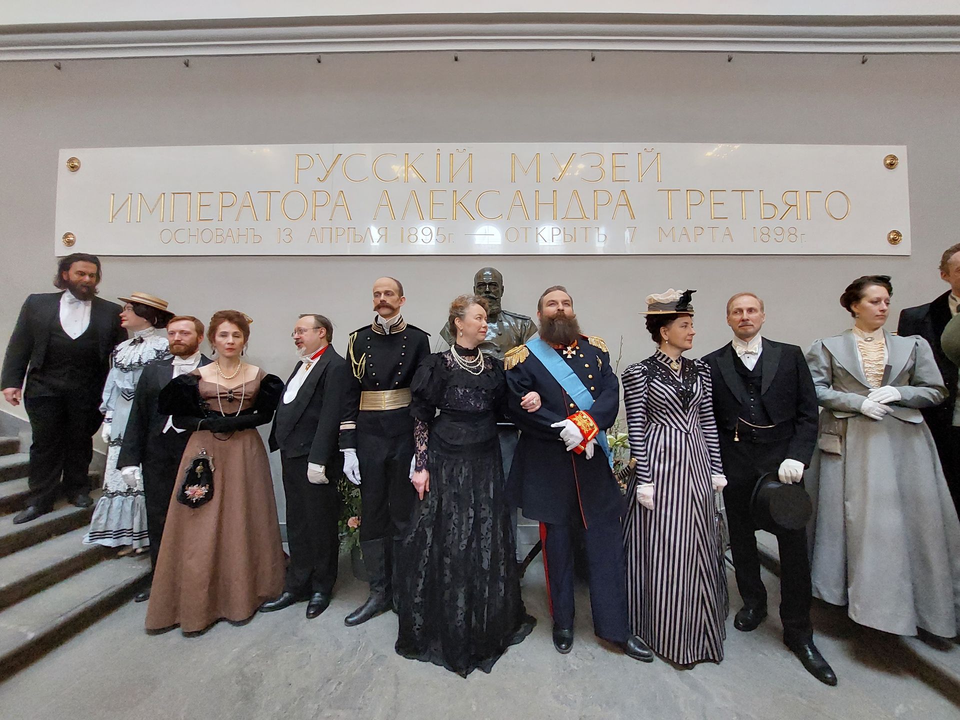 Посетителей встречают «гости из прошлого» в аутентичных костюмах конца XIX столетия. Актеры перевоплотились в первого управляющего музея Александра III, архитектора Леонтия Бенуа, княгиню Марию Тенишеву, а также художников, чьи работы демонстрируются в залах музея: Ивана Шишкина, Илью Репина, Архипа Куинджи.