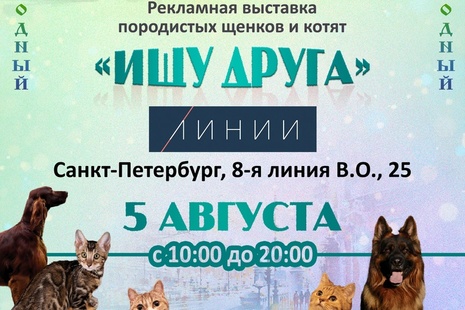 Приглашаем любителей кошек и собак 5 августа на выставку «Зоопланета – Ищу Друга», которая пройдет в бизнес - пространстве «Линии» по адресу: 8 -я линия В.О., 25 (с. м. Василеостровская).