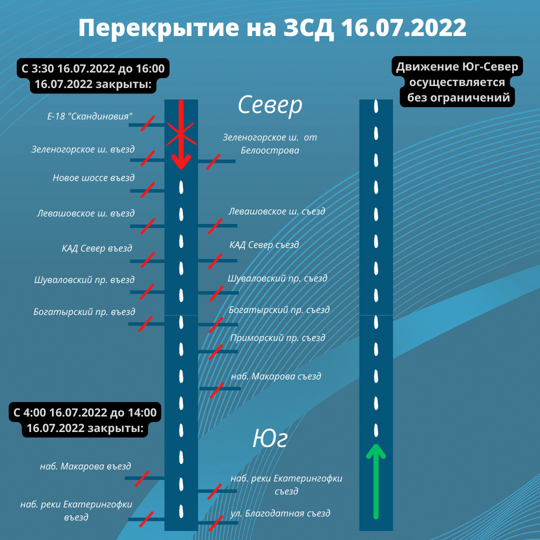 Напомним также, что с 14 по 17 июля на ЗСД будут поочередно закрывать съезды на развязке с набережной Макарова.