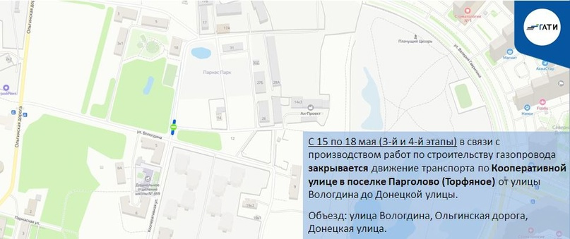 С 15 по 18 мая для строительства газопровода в Парголово перекроют движение по Кооперативной улице от улицы Вологдина до Донецкой улицы, сообщает 12 мая пресс-служба Государственной административно-технической инспекции Петербурга. Объезд предусмотрен по улице Вологдина, Ольгинской дороге и Донецкой улице.