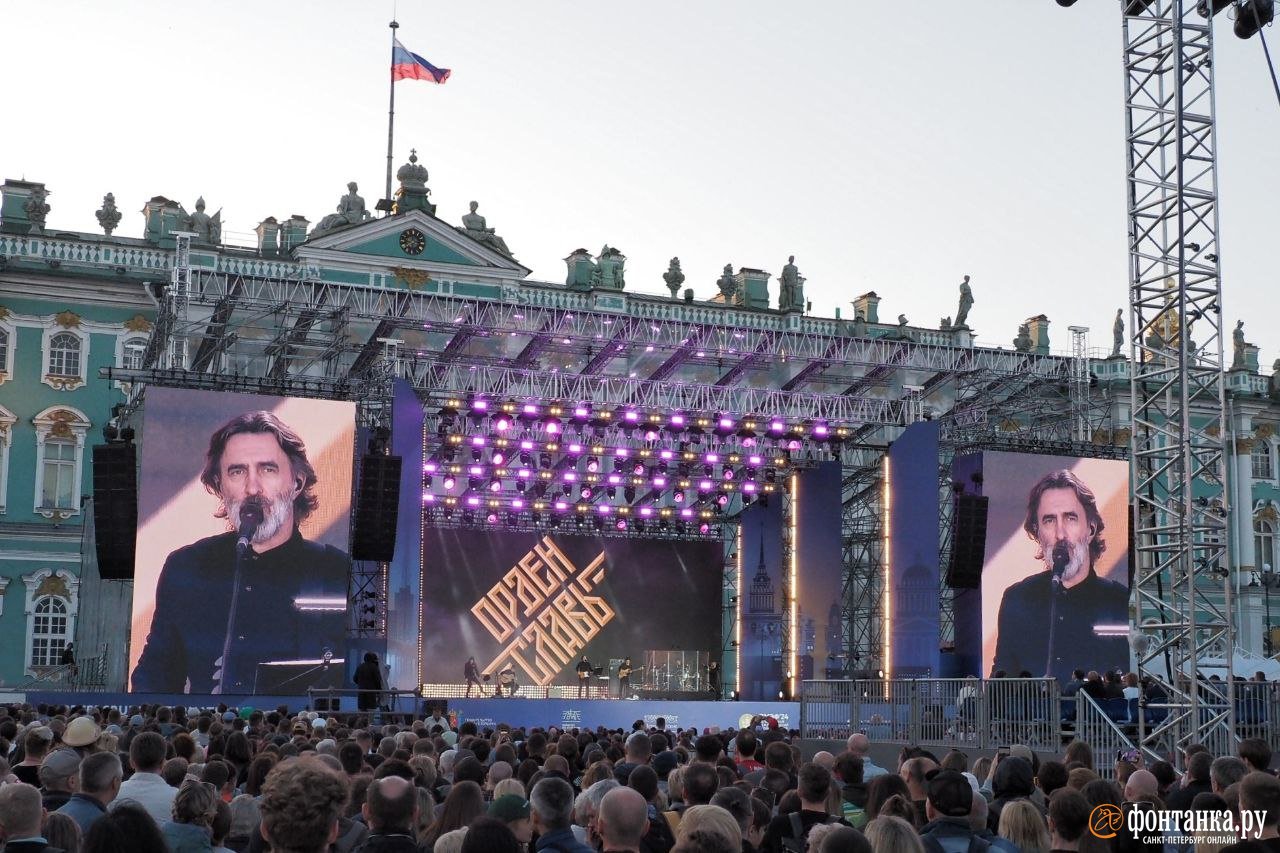 В пятничный вечер на Дворцовой площади было не протолкнуться. И дело не столько в том, что традиционный в дни ПМЭФ концерт был бесплатным. Сегодня там выступал сам Вячеслав Бутусов, фронтмен группы «Ю-Питер», а выходцам из СССР больше известный как бессменный солист Nautilus Pompilius.