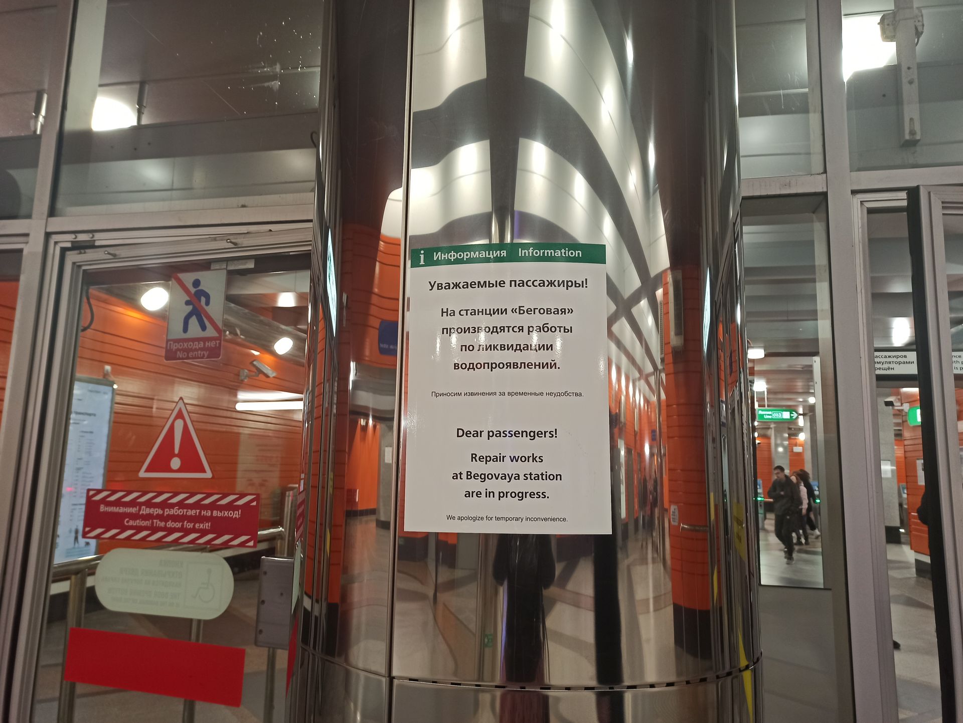 На станции «Беговая» ситуация еще более плачевная. Проблему постоянных протечек в вестибюле городские власти не могут решить уже пять лет со времен ее открытия. Еще тогда специалисты выявили ошибки в технологии гидроизоляционных работ, из-за которых станция начала протекать. Несколько раз со стен вестибюля отваливалась облицовка, а дыры пытались залатать скотчем.