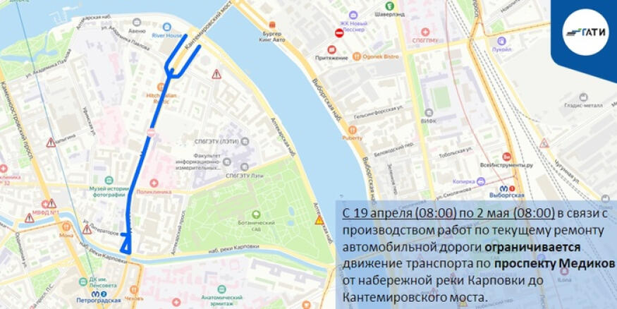 Движение транспорта по проспекту Медиков в Петроградском районе Северной столицы временно ограничат.