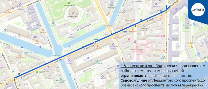 С 8 августа по 4 октября будет ограничено движение по Садовой улице на участке от Лермонтовского проспекта до Вознесенского проспекта, включая перекрестки, сообщает 7 августа пресс-служба Государственной административно-технической инспекции Петербурга. Там будут ремонтировать трамвайные пути.