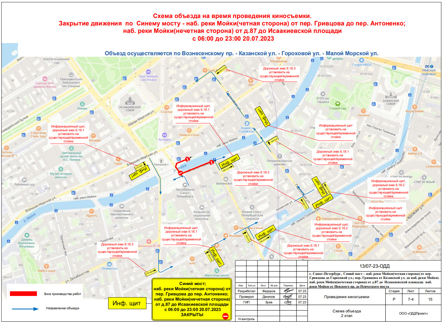 С 6:00 до 23:00 20 и 21 июля для проезда будут закрыты нечетная сторона набережной Мойки от дома 87 до Исаакиевской площади и четная — от переулка Гривцова до Исаакиевской площади, а также участок самой Исаакиевской площади у Синего моста, сообщает 17 июля комитет по транспорту Петербурга. А с 12:00 до 17:00 20 июля перекроют переулок Гривцова от Казанской улицы до набережной Мойки и четную сторону набережной Мойки от переулка Гривцова до Гороховой улицы и от Невского проспекта до Певческого моста.