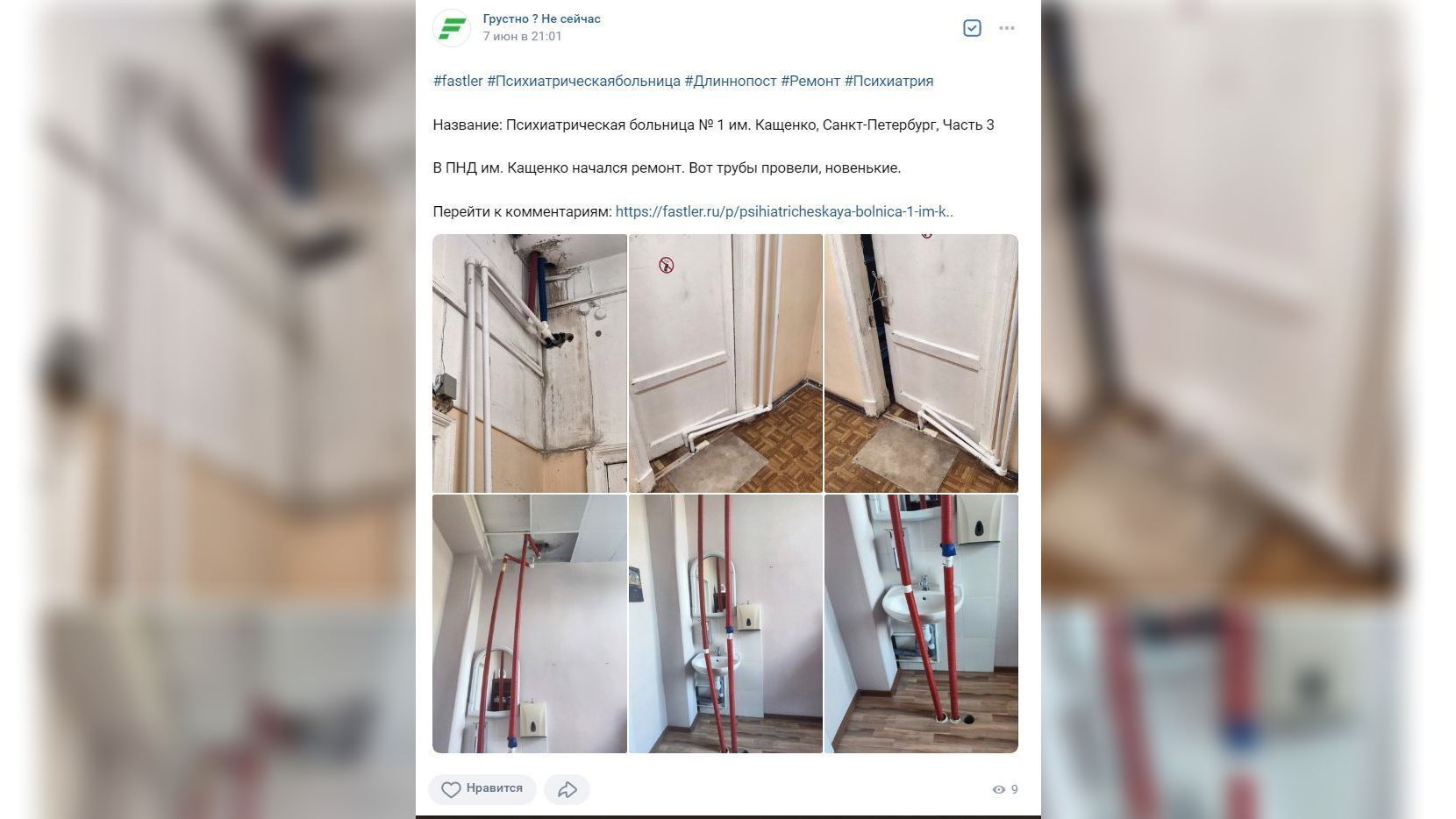 Prt scr vk.com «Грустно? Не сейчас»Кадры результатов странного ремонта в психоневрологическом диспансере больницы имени Кащенко на Старо-Петергофском проспекте, № 50, литера А, вызвали у петербуржцев недоумение. На размещенных в группе «Грустно? Не сейчас» в соцсети «ВКонтакте» фото видно, что трубы проложены где угодно, только не там, где они были бы уместны.