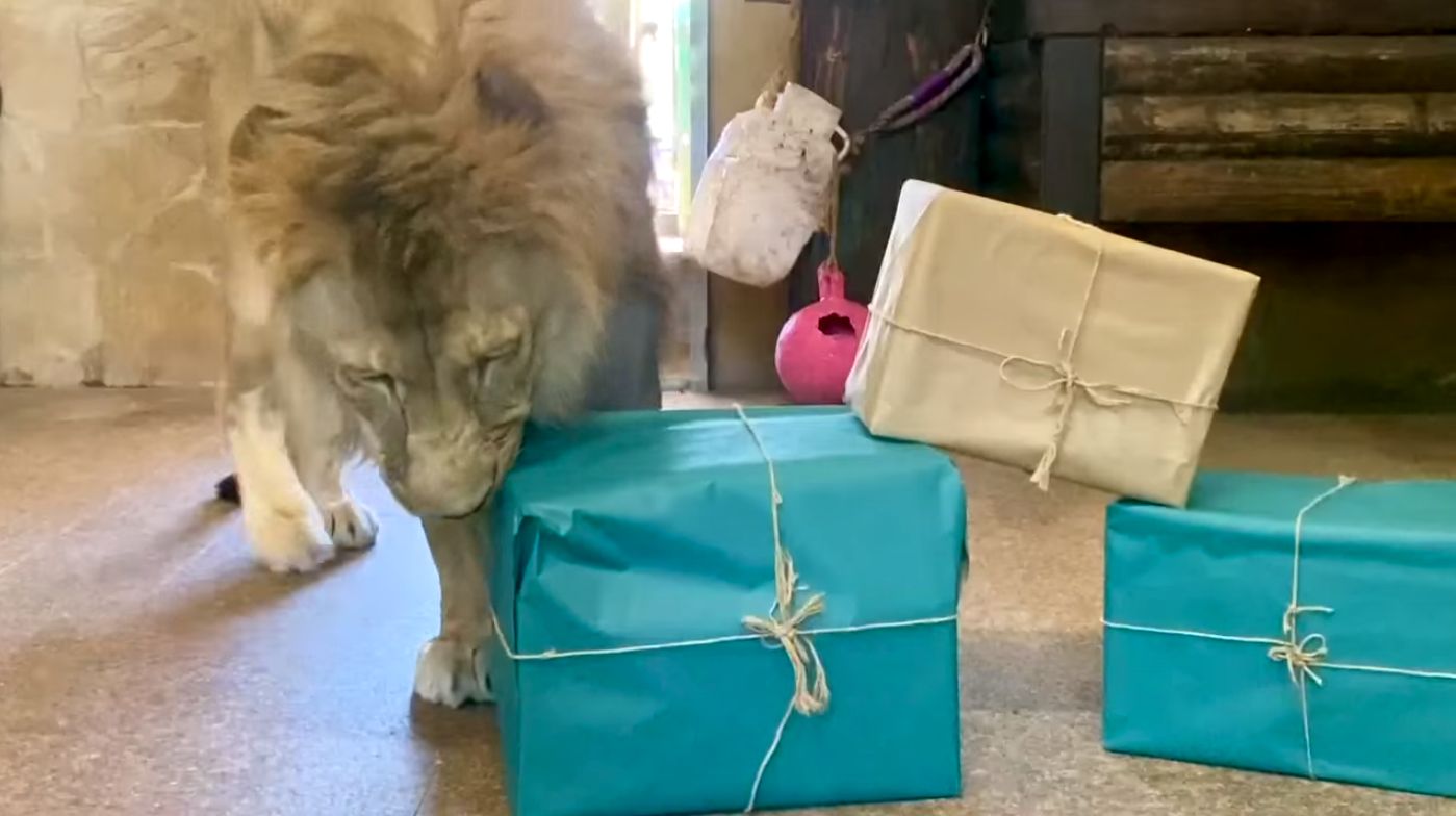Ленинградский зоопарк поздравил льва Адама с 17-летием: львица Таисия опередила его в распаковке подарков