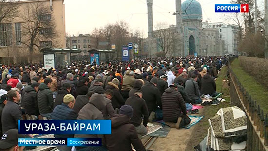 Завершение священного месяца Рамадан, праздник Ураза-байрам отметили на минувшей неделе мусульмане всего мира. Тысячи верующих по традиции собрались в этот день у Соборной мечети на Кронверкском проспекте. Чтобы попасть внутрь, многие занимали места ещё с ночи. Те, кто не смог зайти в мечеть стелили специальные молитвенные коврики на примыкающих улицах. С минарета звучала традиционная проповедь перед намазом. Ураза-байрам - второй по значимости праздник в Исламе, символизирует окончание строгого поста и снятие всех его ограничений. Отмечают его три дня. Верующие подают милостыню, обмениваются с близкими подарками, приглашают в дом друзей и соседей.