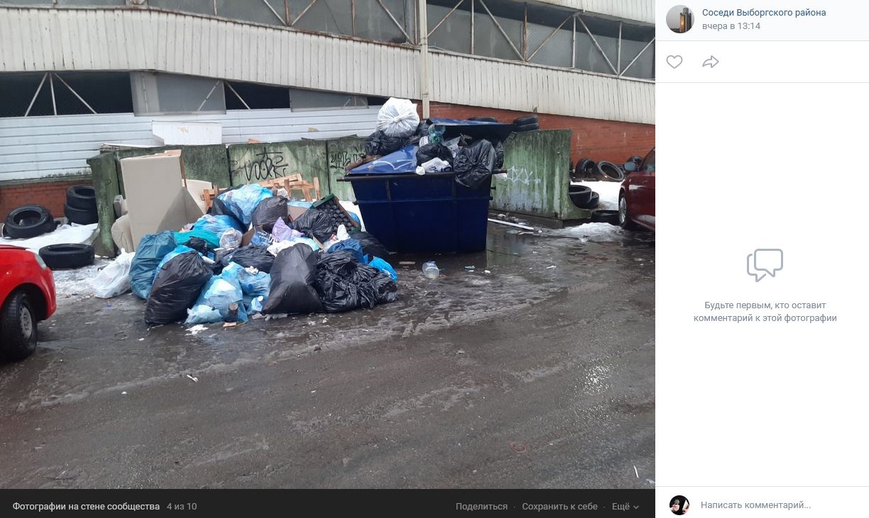 «Звонили в компанию по вывозу мусора, писала им письмо и отправляла фото… Ноль реакции. Мы зарастаем в мусоре. Рядом продуктовый магазин, больница и поликлиника, дети ходят по этой дороге в школу, рядом гараж, люди паркуют машины, а у нас горы не вывезенного мусора и скоро будут крысы. Помогите!» — написала петербурженка. Prt Scr vk.com / «Соседи Выборгского района» Prt Scr vk.com / «Соседи Выборгского района» Подобная проблема есть и в других районах города на Неве. Об этом сообщили в группе «Выборгский район #Бакан».