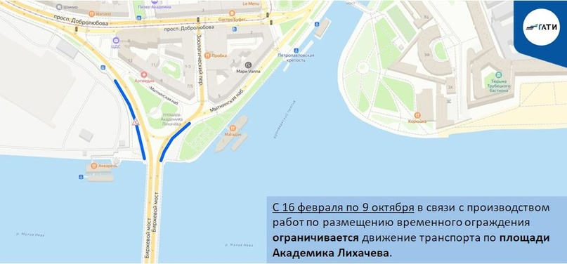 На Петроградской стороне до 9 октября ограничат движение на площади Академика Лихачева, сообщает 14 февраля пресс-служба Государственной административно-технической инспекции Петербурга. Там разместят временные ограждения.