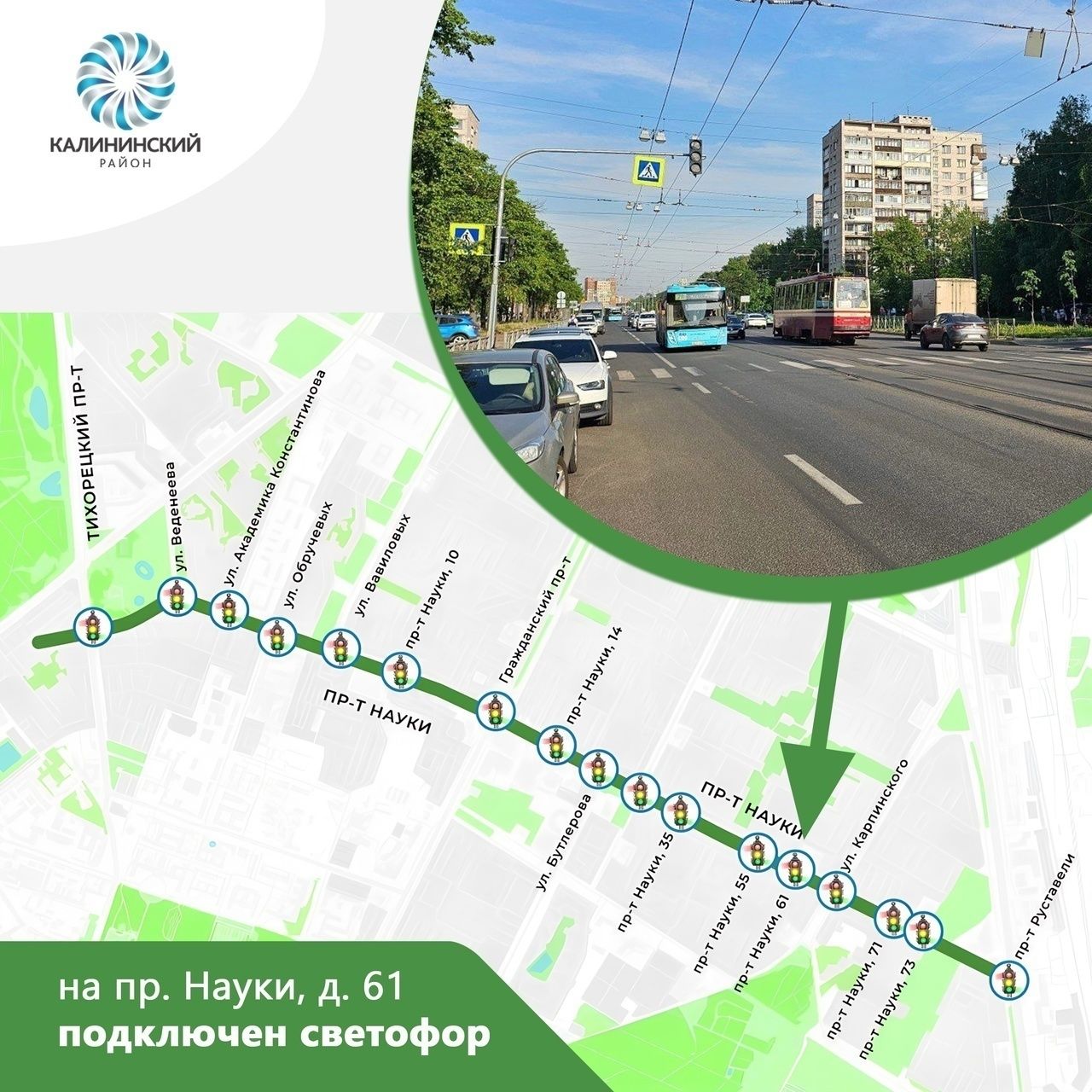 В Петербурге на проспекте Науки возле дома 61 в рамках работы по обеспечению приоритетного движения общественного транспорта подключён светофор.