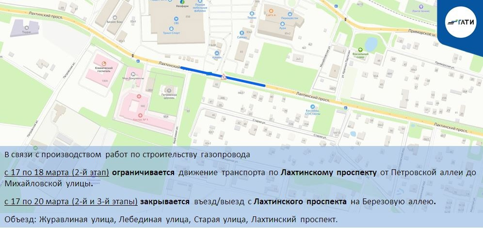 На Лахтинском проспекте начинаются второй и третий этапы строительства газопровода. Из-за работ с 17 по 18 марта будет ограничено движение по Лахтинскому на участке от Петровской вллеи до Михайловской улицы. А до 20 марта перекроют въезд и выезд с Лахтинского проспекта на Березовую аллею.