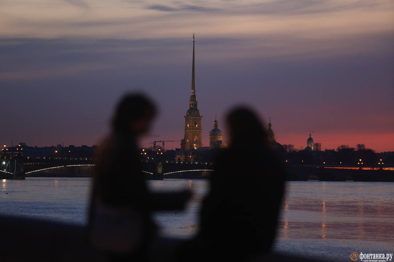 Небо в Петербурге окрасилось в нежно-малиновый. Силуэты людей и птиц вечером 15 апреля ловил фотограф «Фонтанки». Лёгкий ветер рябит воду, освободившуюся ото льда. На поверхности Невы отражаются шпиль Петропавловского собора и мерцающие огни Троицкого моста, а по набережной Кутузова гуляют горожане: задумчиво глядят в воду или что-то неспешно обсуждают.