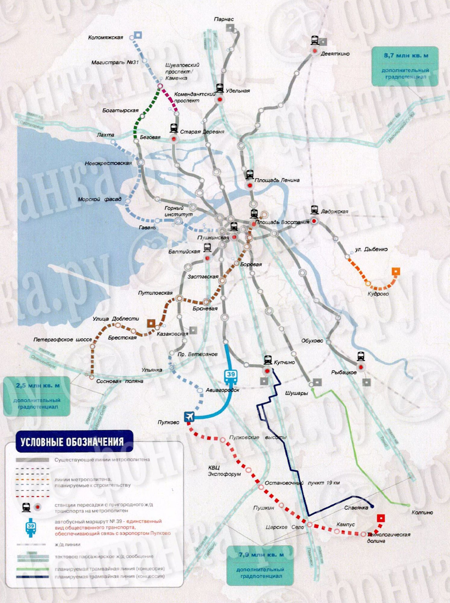 В разряд «основных» пулковский вариант метро перебрался в последние годы . Он есть в Генплане с промежуточными станциями «Ульянка» и «Авиагородок», город выдал задание на проект планировки территории под эти новые 7 км подземки , президенту доложили о планах на строительство — причем с перспективой продлить линию до кампуса СПбГУ через «Экспофорум» и Пушкин. Примерно обозначен срок — до 2035 года и общая стоимость — полтриллиона рублей.