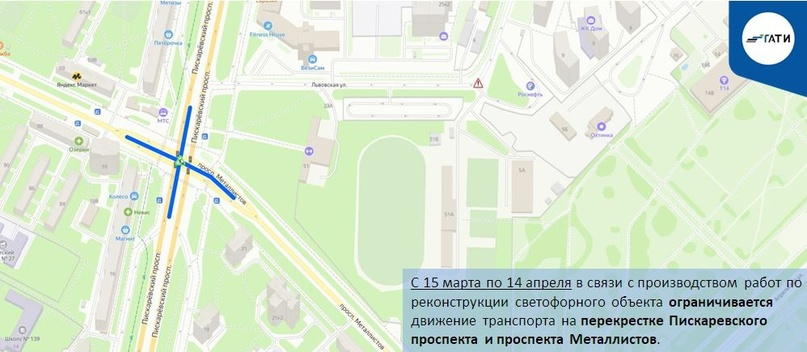 До 14 апреля будет ограничено движение транспорта на перекрестке Пискаревского проспекта и проспекта Металлистов . Там запланирована реконструкция светофорного объекта.