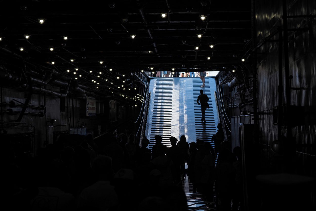 Перед трапом всех останавливают, военнослужащий предупреждает, что пускать на корабль будут группами по 20 человек. Считают, разумеется, неточно.