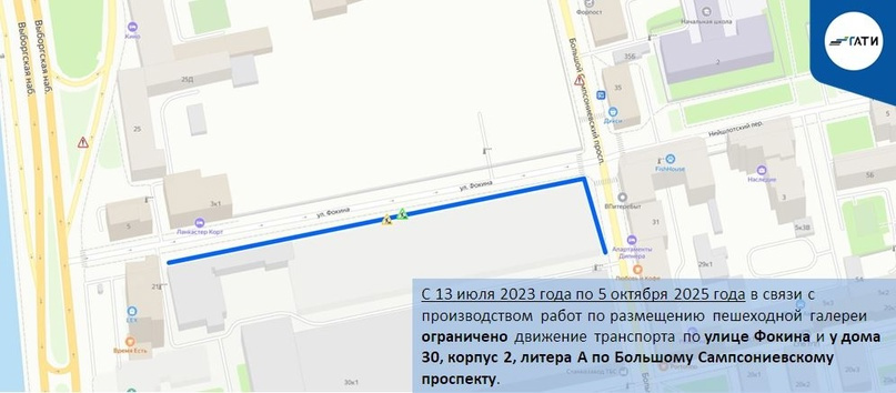 С 13 июля 2023 года по 5 октября 2025 года будет ограничен проезд по улице Фокина и у дома 30, корпус 2, литера А по Большому Сампсониевскому проспекту. Движению транспорта будет мешать пешеходная галерея.