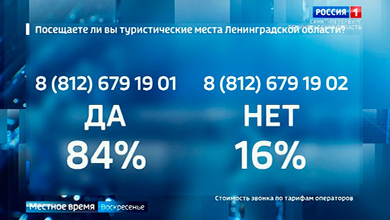 Подведём итоги голосования. Большинство ответили, что посещают туристические места Ленинградской области. Об этом говорит и статистика. На недавнем Экономическом форуме регион представил подробные цифры: если шесть лет назад в область приехали почти полтора миллиона отдыхающих, то в прошлом году - более шести миллионов человек: это только туристы, без учёта кратковременных экскурсий. И текущая задача - об этом говорилось в интервью - сделать так, чтобы гости задерживались в регионе подольше. А, значит, нужны современные, доступные по цене гостиницы - дефицит пока всё-таки есть, и - хорошие дороги.