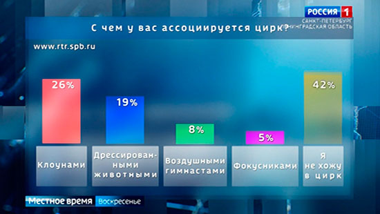 Итоги голосования - оно всю неделю шло на сайте и страницах нашего телеканала в Интернете. Мы хотели узнать, с чем у вас ассоциируется цирк? В опросе приняли участие почти 9 тысяч человек. Вот результаты. Клоунов - не могут забыть 26 процентов респондентов. Дрессированные животные - выбор почти 19 процентов наших зрителей. Воздушные гимнасты - восхищают 8 процентов. Фокусники - 5 процентов. "Я не хожу в цирк", - так ответили более 42 процентов участников голосования, и это - большинство.