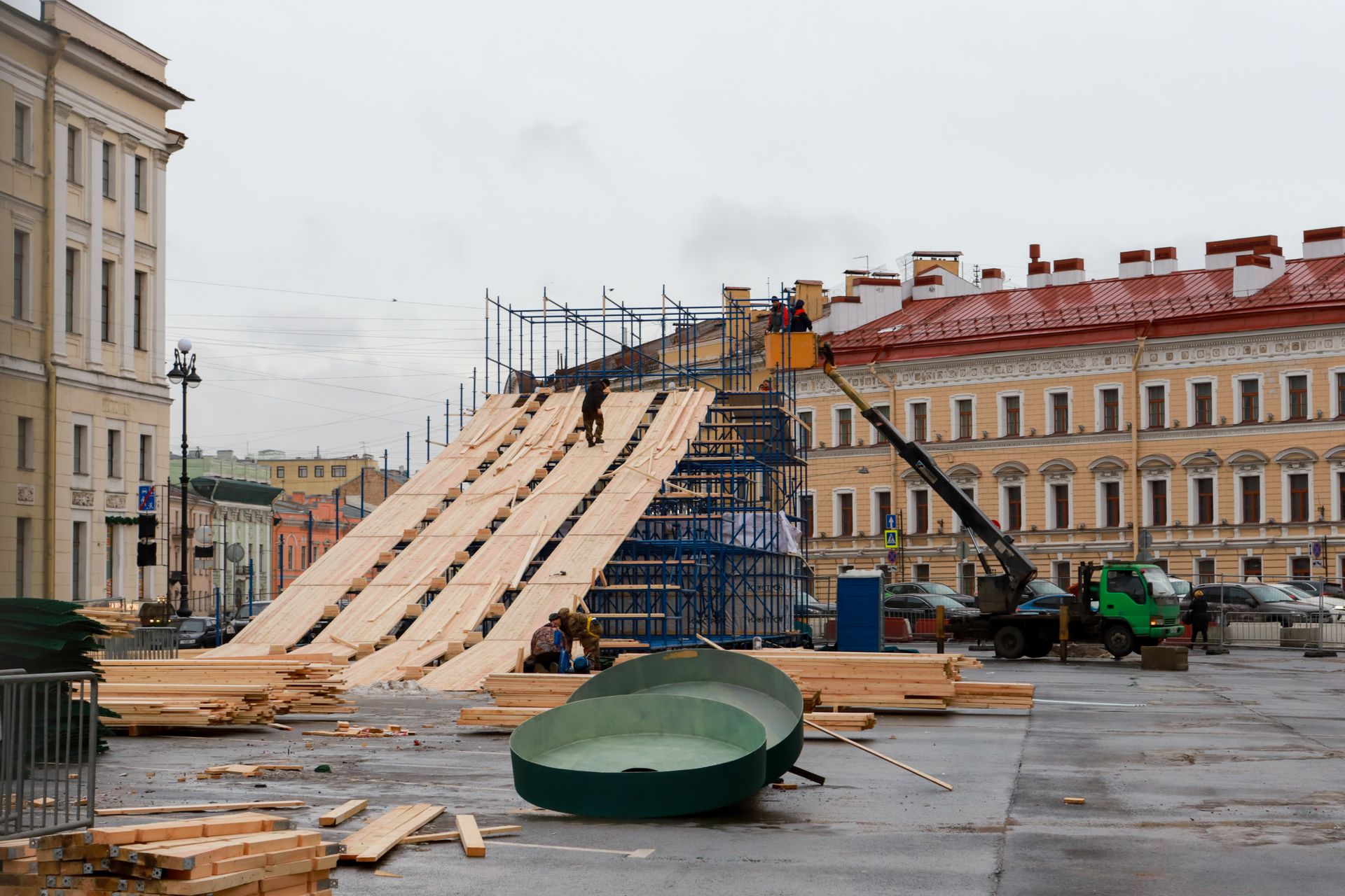 НЕВСКИЕ НОВОСТИ / Надежда Капранова Гигантский зимний аттракцион на Дворцовой площади — деревянную горку, по которой можно было кататься на тюбинговых ватрушках, закрыли 15 января. Корреспондент НЕВСКИХ НОВОСТЕЙ запечатлел, как рабочие разбирают сооружение на части.