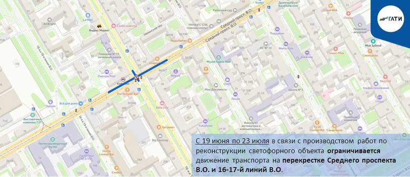 С 19 июня по 23 июля ограничат движение на перекрестке Среднего проспекта В.О. и 16–17-й линий В.О . Там начинают реконструкцию светофора.