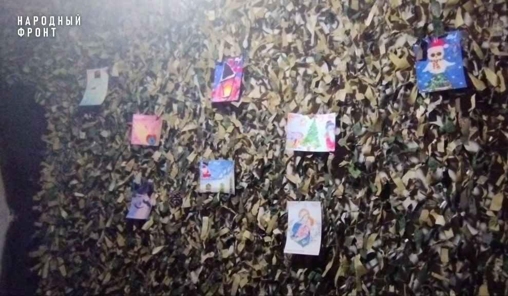 Волонтеры петербургского отделения «Народного фронта» доставили в зону специальной военной операции детские рисунки. Картины юных художников бойцы разместили на маскировочной сети.