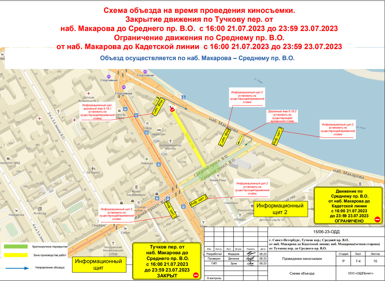 Для проведения киносъемок с 16:00 21 июля до 23:59 23 июля закроют проезд по Тучкову переулку от набережной Макарова до Среднего проспекта В.О., сообщает 18 июля пресс-служба комитета по транспорту Петербурга. Одновременно будут перекрывать движение по Среднему проспекту В.О. от набережной Макарова до Кадетской линии, но не более чем на 20 минут в час.