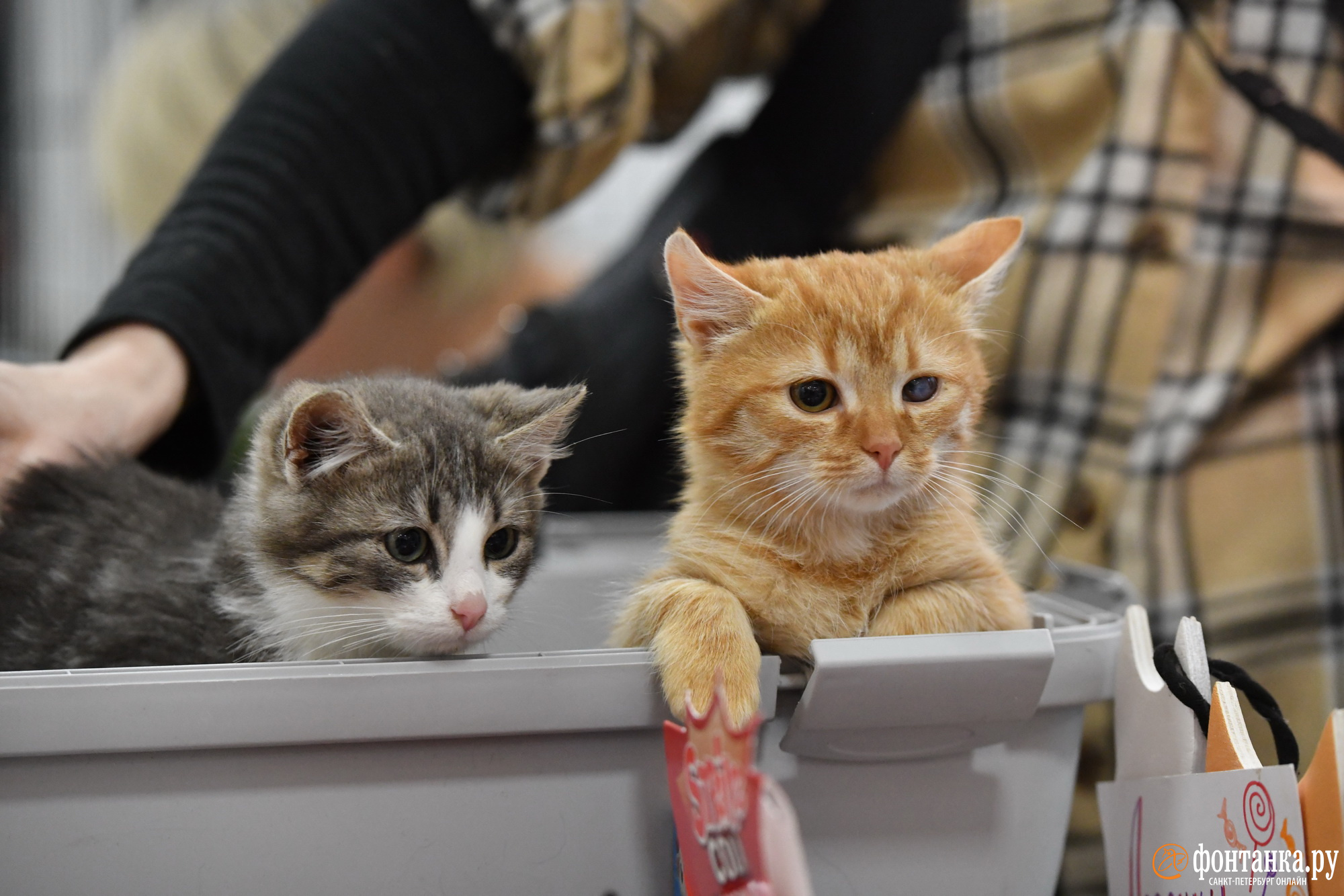 В холле ДК Кирова шумно: одни толпятся у клеток с котами и осторожно просовывают пальцы меж прутьев, другие бегут к пуфикам — обниматься с собаками. В коробке за одним из столиков жмутся друг к другу три котенка: два серых и рыжий, с пораженным инфекцией глазом.