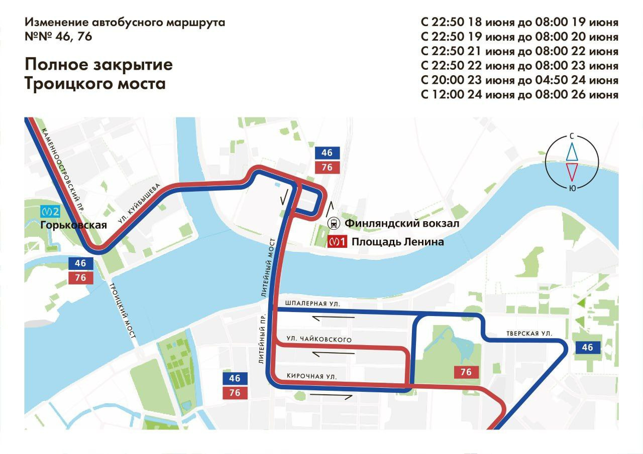 с 8:00 до 22:50 19 июня; с 8:00 20 июня до 22:50 21 июня; с 8:00 до 22:50 22 июня; с 8:00 до 20:00 23 июня; с 4:55 до 12:00 24 июня. Фото: Комитет по транспорту ПетербургаПерекрытия также внесут изменения в трассы автобусных маршрутов № 46 и № 76 и трамвая № 3. Подробнее об измененных маршрутах можно узнать на сайте ГКУ «Организатор перевозок» . А о том, какие еще ограничения движения и парковки вводятся в центре Петербурга в связи с «Алыми парусами», читайте здесь .