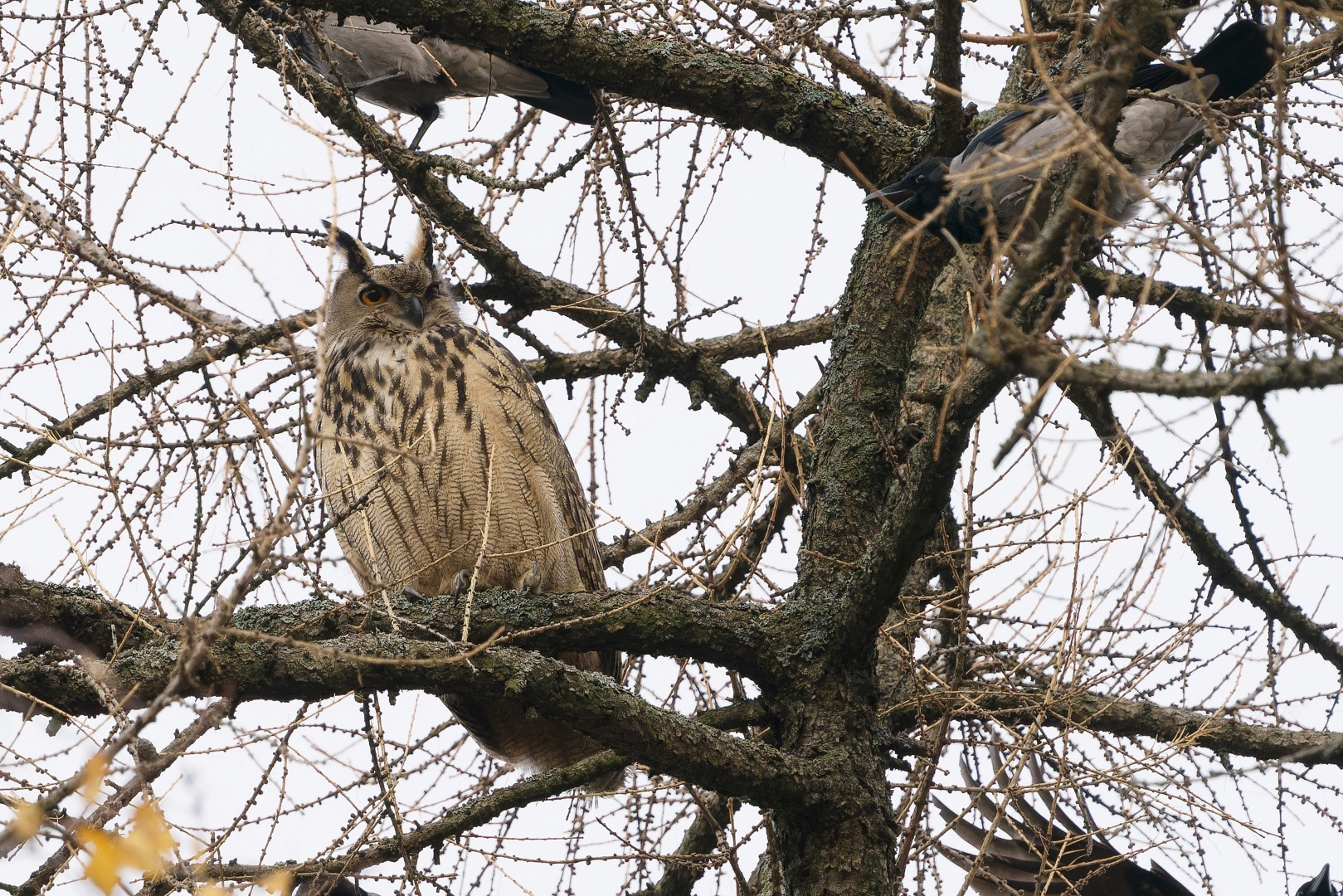 Фото: Каждой твари по паре / Павел ГлазковПо словам Павла Глазкова, прилетевшая несколькими днями ранее на Елагин длиннохвостая (уральская) неясыть , настолько освоилась, что попыталась прогнать филина. В качестве аргумента о необходимости покинуть территорию, неясыть использовала попытку дернуть филина за хвост. Еще одна была предпринята стаей серых ворон: они набросились на редкого гостя стаей. При этом, вороны разделились: часть кружила в воздухе, издавая пронзительные звуки, другие пытались орудовать клювами.