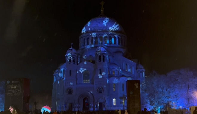 В Кронштадте сегодня на Морском соборе в честь Дня Санкт-Петербурга на выставке-форуме «Россия» впервые в истории города устроили мультимедийное лазерное шоу.