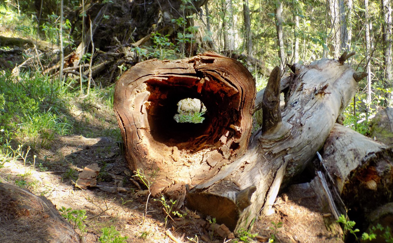 Не знаешь, восторгаться или грустить. Огромные стволы падают от старости, их распиливают на фрагменты и оставляют. Кругом заросли елок, многие из которых уже высохли. Нередко лиственницы теряются среди других пород, которые их затеняют и вытесняют. Им уже не хватает ни света, ни пространства. Зайти в глубь леса из‑за бурелома практически невозможно. Впрочем, как пояснили специалисты ООПТ Ленинградской области, древесные остатки не убирают потому, что в них есть жизнь: занесенные в областную Красную книгу мохообразные, лишайники, грибы и несколько видов насекомых. Их жизнь так же ценна, как и жизнь древней лиственницы.