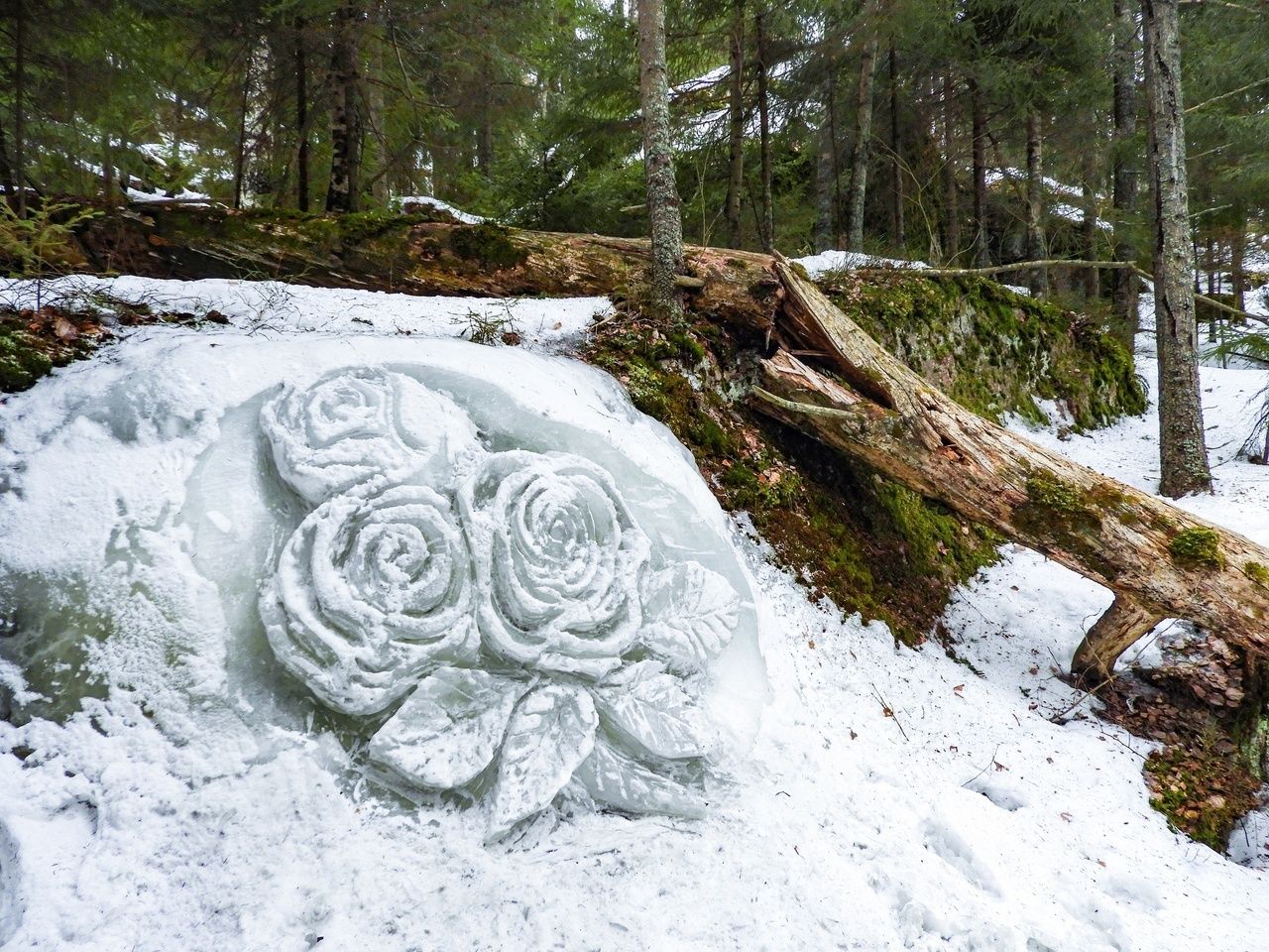 Лесничий парка Монрепо Владимир Чантурия подготовил традиционный подарок женщинам на 8 Марта. Там появились ледяные цветы.