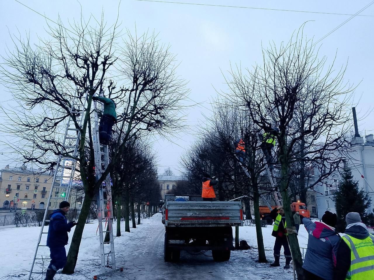 В Петербурге на Среднеохтинском проспекте провели формовочную обрезку деревьев