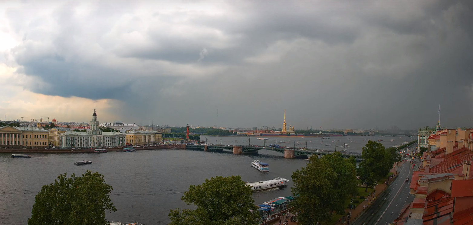 Как и прогнозировалось, в Санкт-Петербурге прошли пусть и кратковременные, но довольно сильные дожди. Некоторые улицы оказались затопленными. Сначала небольшая туча омрачила погоду жителям центра города, а затем двинулась на север.